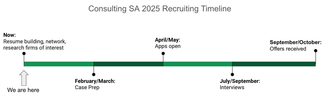 SA 2025: We’re early in this process so researching firms of interest and networking with professionals should be the priority. It’s not a bad idea to start case prep so that you know how to approach them properly when interviews come around.