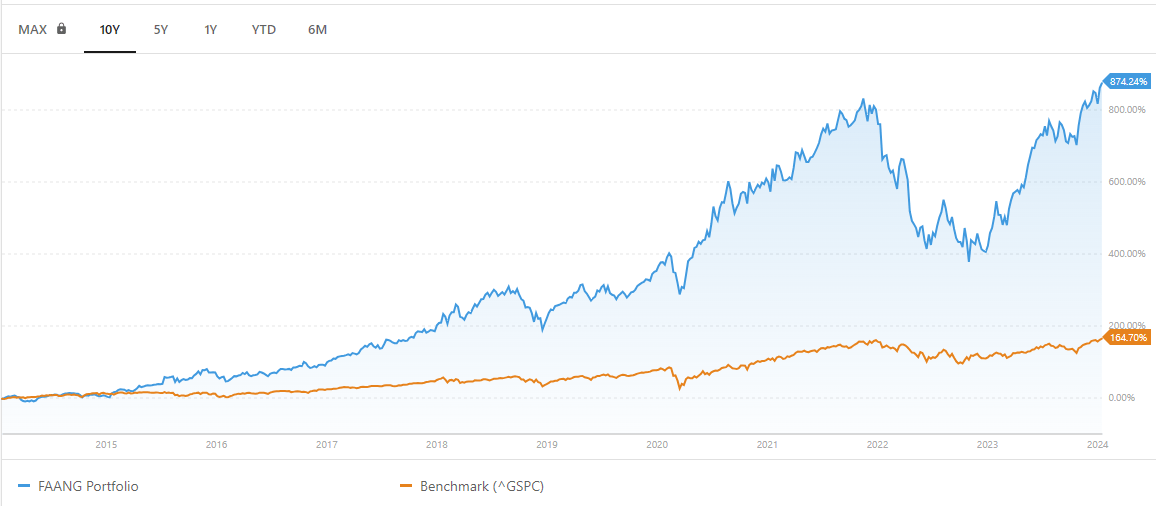 FAANG vs. S&P Performance over 10 years (mad bread)