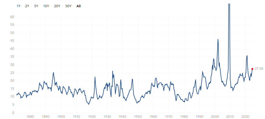 S&P 500 PE Ration at 27.6x (Source: multipl.com)