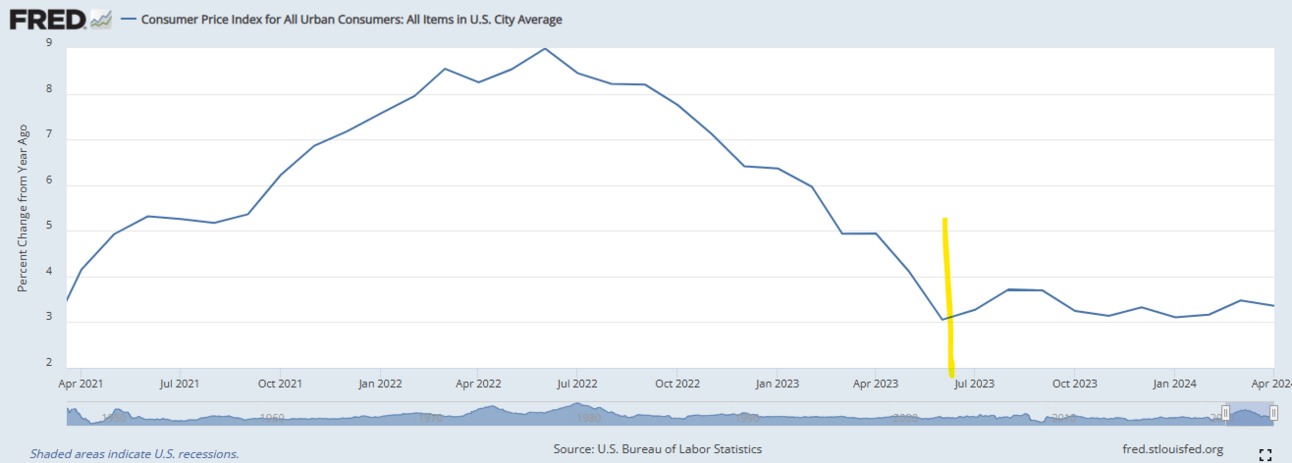 Inflation has decreased, but hasn’t budge in nearly 1 year (Source: FRED)