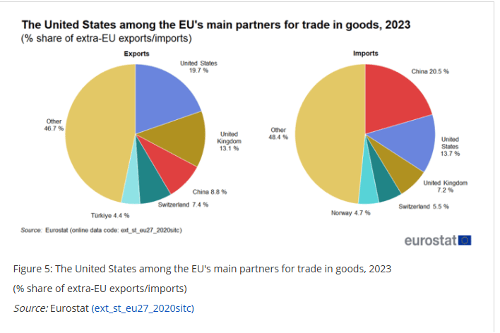 Roughly 19% of exports to the US and 14% of imports from the US (Source: Eurostat)