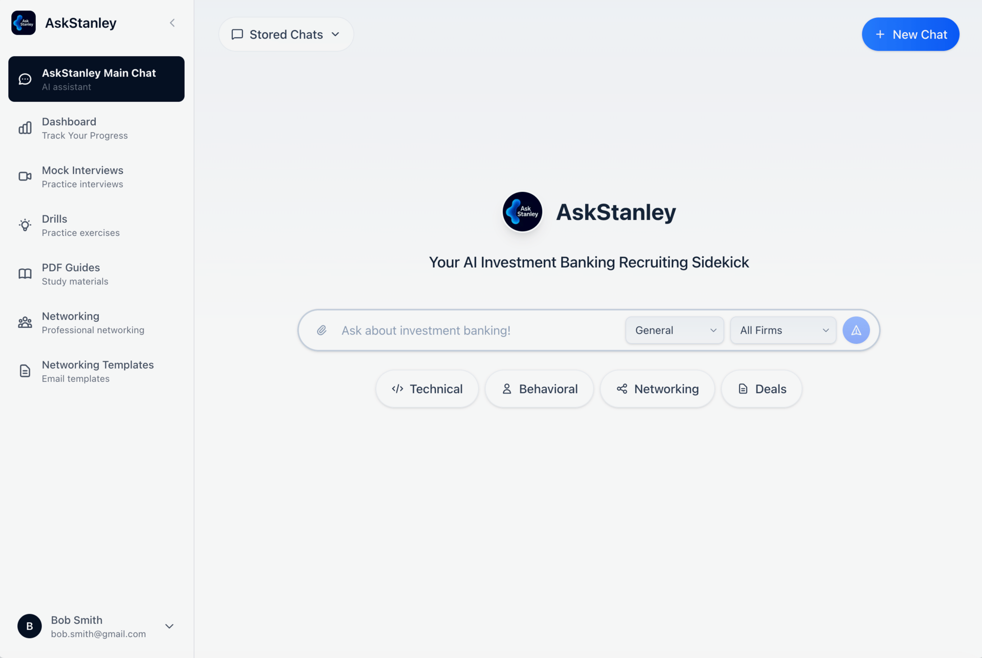 AskStanley is an AI investment banking recruiting sidekick trained on thousands of technical questions, behaviorals, resumes, and more!