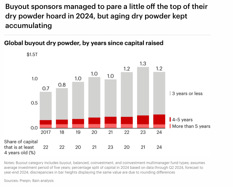 We can also see in addition to fundraising difficulties, firms are having trouble putting aging dry powder to work.
